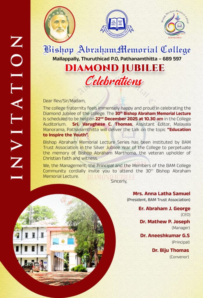 B. A. M. college is named after Bishop Abraham Mar Thoma Metropolitan. For him, life was to wear out than to rust out. The institution upholds these ideas and conveys to the student community that devotion to truth and disciplined behaviour are the prime requirements for a successful life.